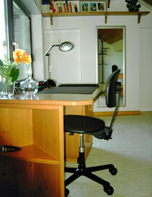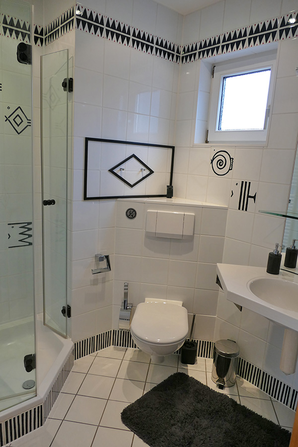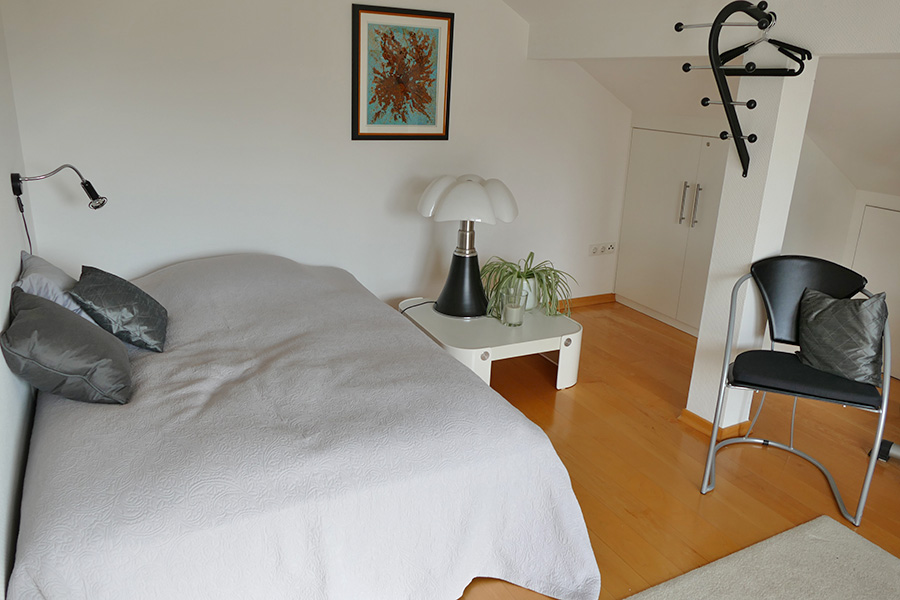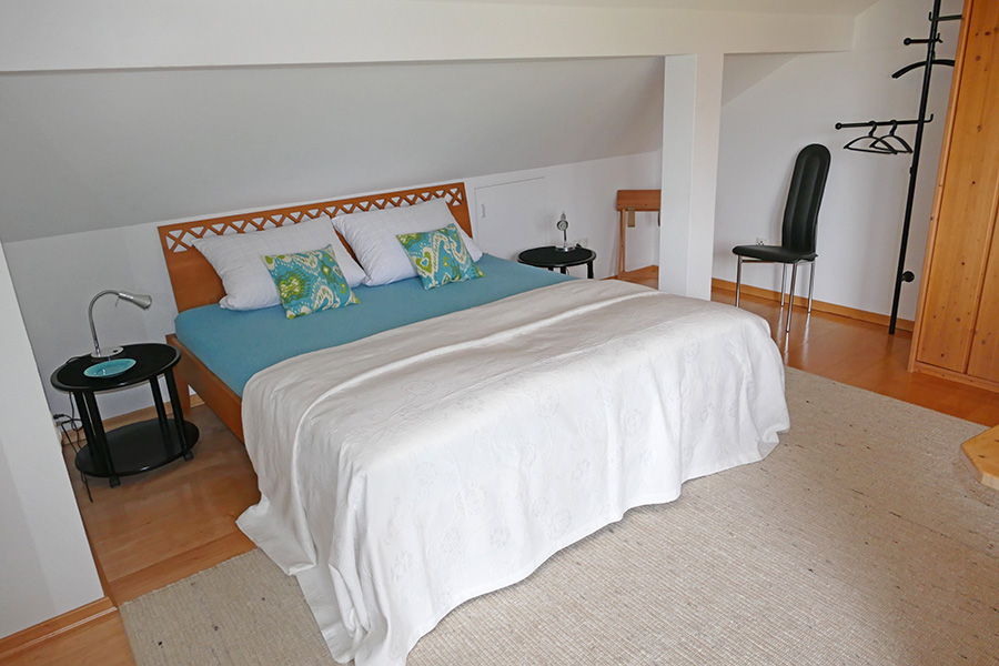 Der neu eingerichtete Schlafraum mit Doppelbett (7 Zonen-Wellnessmatraze), Kleiderschrank sowie Schreibtisch und Bürostuhl wird zusammen mit dem freundlichen, hellen Sanitärbereich (Dusche/WC, Föhn, Kosmetikspiegel Bademäntel etc.) auch gehobenen Ansprüche gerecht.