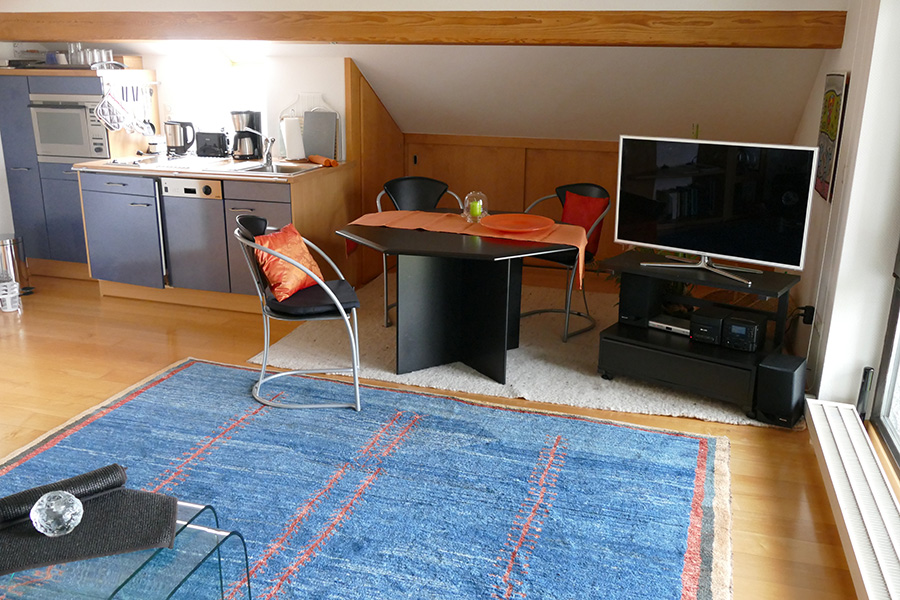Das kombinierte großzügig ausgestattete Wohn-/Esszimmer mit Sitzcouch, SAT TV und Stereoanlage sowie WLAN-Anschluss wird ergänzt durch eine modern eingerichtete Küchenzeile. Diese ist u.a. ausgestattet mit ***Kühlschrank, Spülmaschine, Elektroherd, Mikrowelle Plus-Kompaktgerät, Kaffeemaschine, Toaster und Eierkocher.